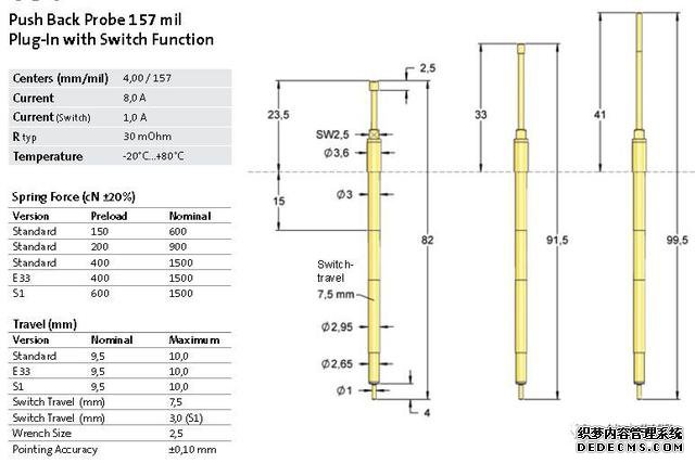 push back針具有很強大的彈力能夠直接接觸并反推待檢物體和結合機械機構進行連接測試;一旦待檢物體安裝正確,就能夠承受并壓制住此針,這種壓力能夠開啟這種開關的功能,該功能通過探針(內(nèi)置開關),或者針套亦或在下層安裝的一個接觸探針來實現(xiàn)。