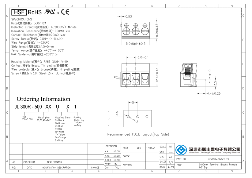 產(chǎn)品分類:接線端子 產(chǎn)品型號(hào):螺釘式PCB接線端子 間距5.00mm 詳細(xì)型號(hào):螺釘式PCB接線端子-JL300R,間距5.00mm,CE認(rèn)證,UL證書 產(chǎn)品介紹:材質(zhì)電鍍(MATERIAL) , 螺絲(Screw)M2.0,鋼,鍍鋅