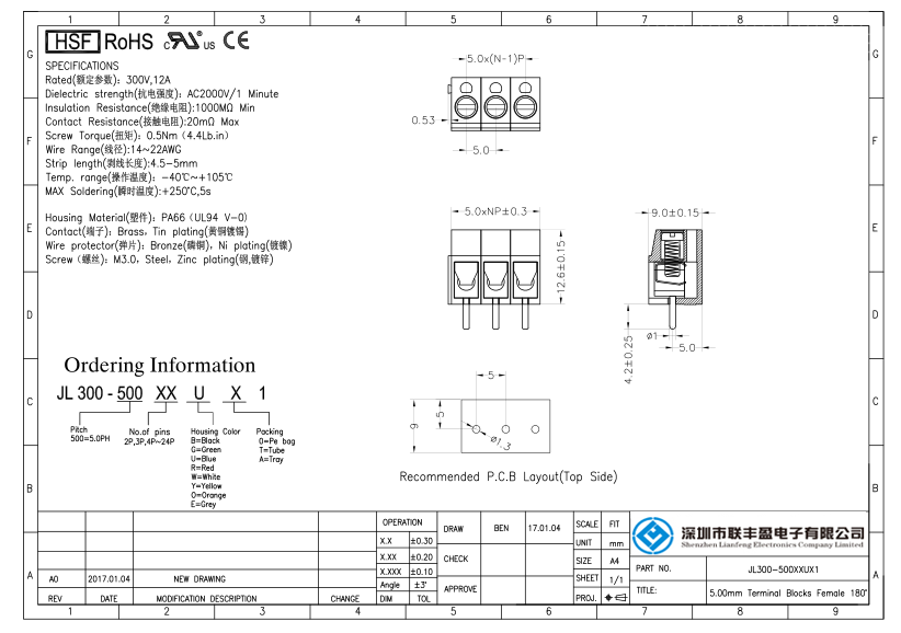產(chǎn)品分類(lèi):接線端子 產(chǎn)品型號(hào):螺釘式PCB端子 間距5.00/7.50mm 詳細(xì)型號(hào):螺釘式PCB接線端子-JL300,間距5.00/7.50mm,CE認(rèn)證,UL證書(shū) 產(chǎn)品介紹:材質(zhì)電鍍(MATERIAL) , 螺絲(Screw)M2.0,鋼,鍍鋅