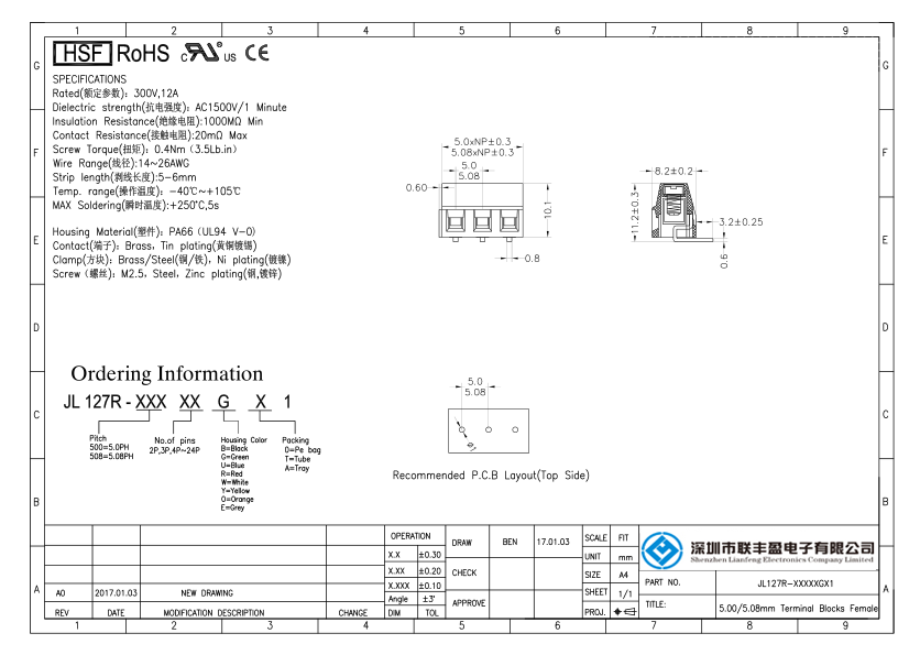 產(chǎn)品分類:接線端子 產(chǎn)品型號(hào):螺釘式PCB接線端子-127R,間距5.00/5.08mm, 產(chǎn)品介紹:材質(zhì)電鍍(MATERIAL) , 螺絲(Screw)M2.0,鋼,鍍鋅Steel,Zinc Plated 彈片(Reed)黃銅,鍍鎳Brass,Ni plat
