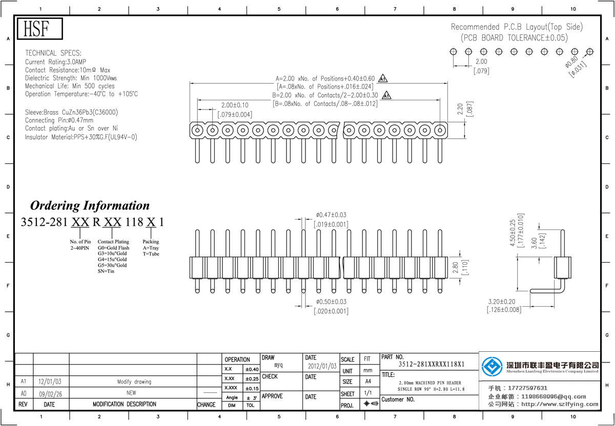 產(chǎn)品分類:圓孔排針排母連接器 產(chǎn)品型號:聯(lián)豐盈 2.0MM 單排 H=2.8 R/A 圓型排針 技術(shù)參數(shù):額定電流:3.oamp接觸電阻:1om最大介電強(qiáng)度:MIN1000vrms機(jī)械壽命:最少500次交配引腳:0.400.66mm或