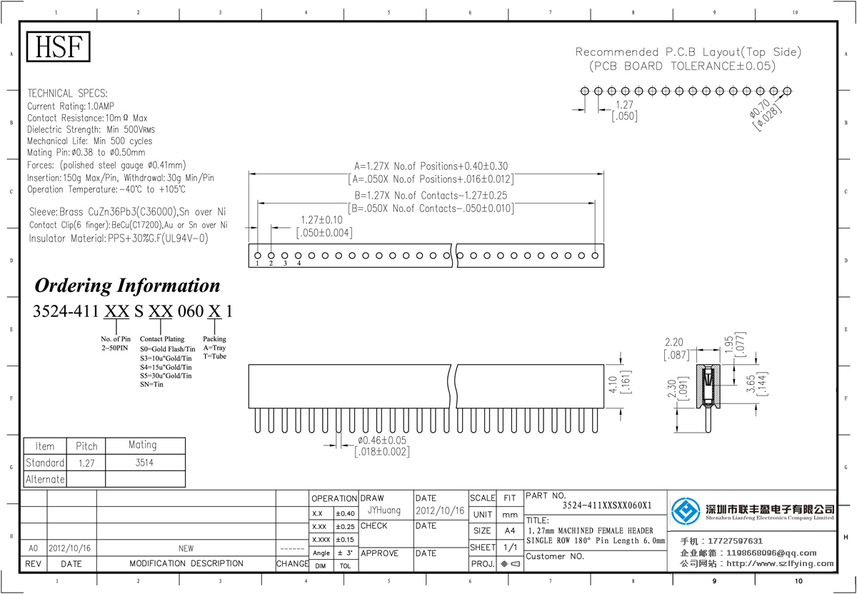 產(chǎn)品分類:圓孔排針排母連接器 產(chǎn)品型號:1.27MM間距 直插型 針長=6.0 技術(shù)參數(shù):額定電流:1.0amp接觸電阻:10m0 Max Dielectric強度:500vrm5機械壽命:最少500次交配銷:0.380.50mm力量:(拋