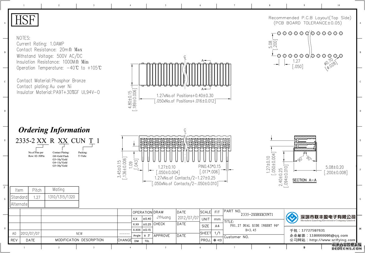 產(chǎn)品規(guī)格:聯(lián)豐盈 1.27MM 雙排 180度SMT 側(cè)插型 排母 H=3.5