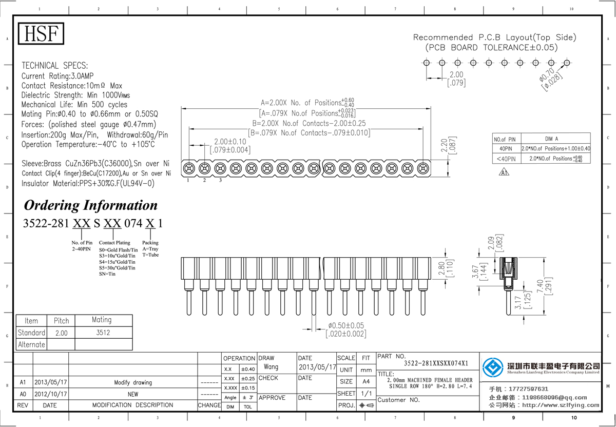 產(chǎn)品分類:圓孔排針排母連接器 產(chǎn)品型號:2.0MM 單排 S/T 圓孔排母 連接器 聯(lián)豐盈 技術(shù)參數(shù):額定電流:3.oamp接觸電阻:1om最大介電強(qiáng)度:MIN1000vrms機(jī)械壽命:最少500次交配引腳:0.400.