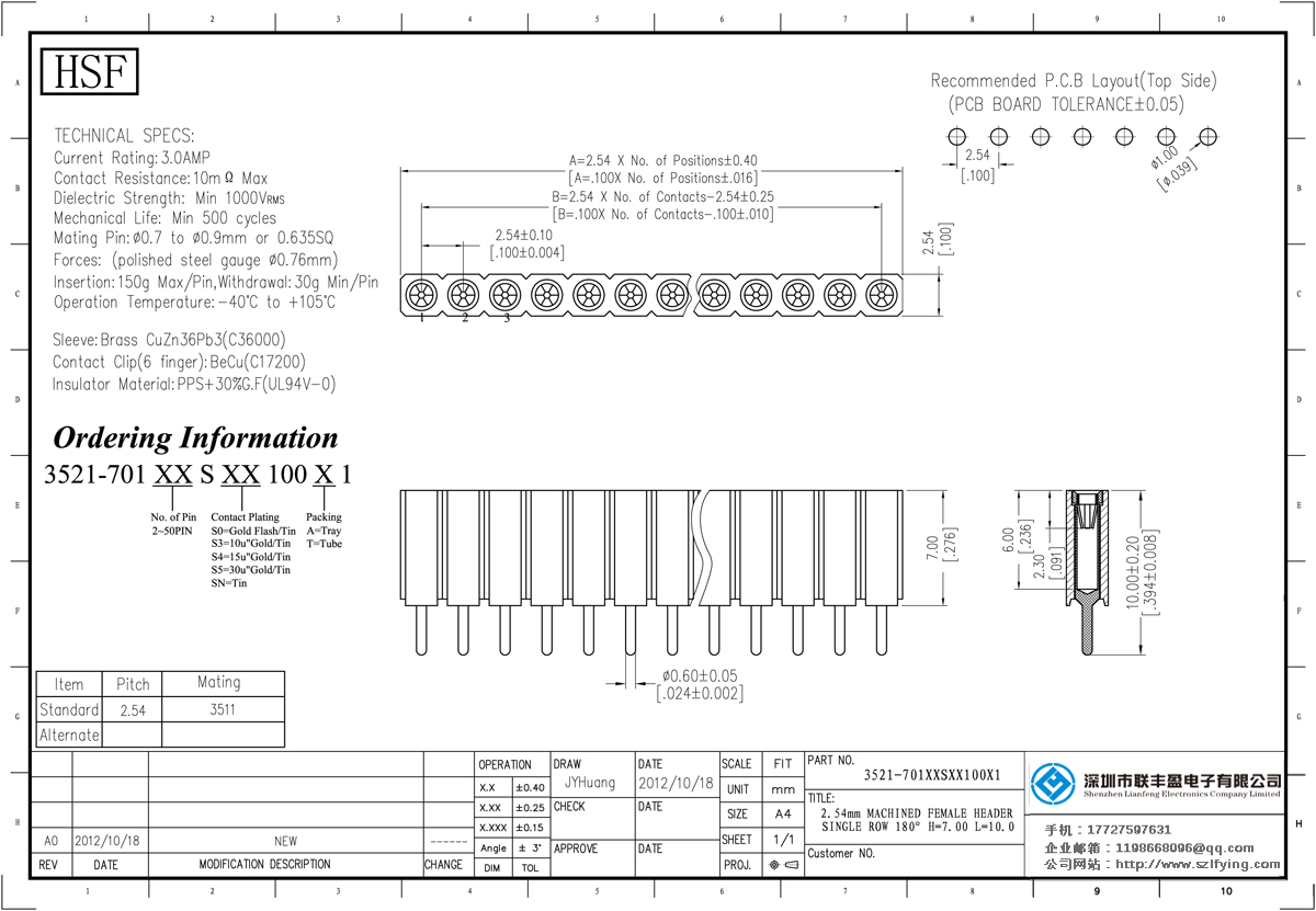 產品分類:圓孔排針排母連接器 產品型號:聯(lián)豐盈 2.54MM 單排 H=7.0 S/T 圓孔排母 技術參數:額定電流:3.oamp接觸電阻:1om最大介電強度:MIN 1000vrms機械壽命:最少500次交配引腳:0.70.9mm或