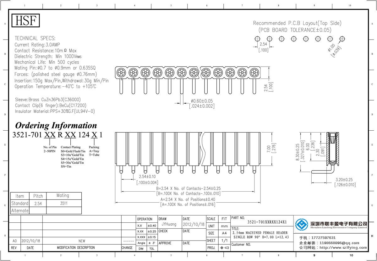 產(chǎn)品分類:圓孔排針排母連接器 產(chǎn)品型號:聯(lián)豐盈 2.54MM 單排 H=7.0 90度彎插 圓孔排母 技術參數(shù):額定電流:3.oamp接觸電阻:1om最大介電強度:MIN 1000vrms機械壽命:最少500次交配引腳: