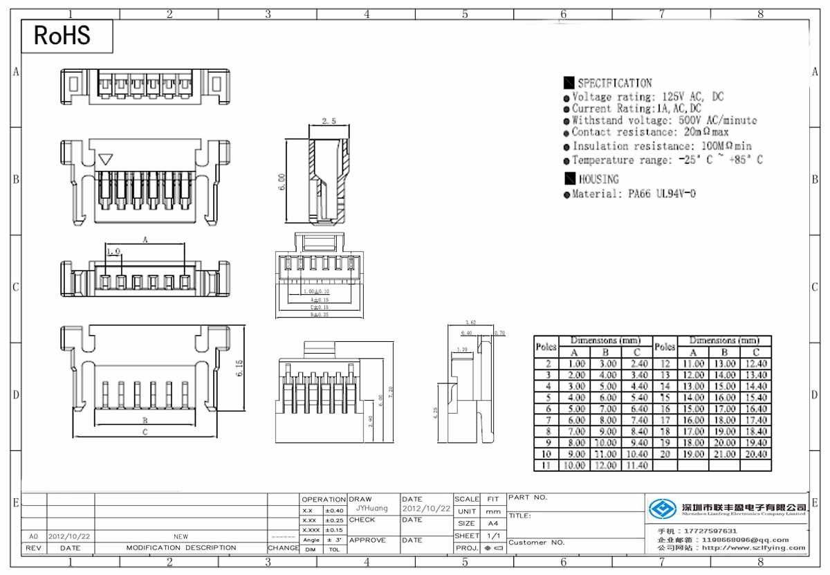 間距(Pitch):1.0mm 線數(shù)(Poles):2-20 適用線規(guī)(Applicable wire):AWG#28-32 額定電壓(Voltage rating):125V AC/DC 額定電流(Current rating):1A AC/DC 耐壓值(Withstand voltage):500V AC/minute 工作溫度(Working temper