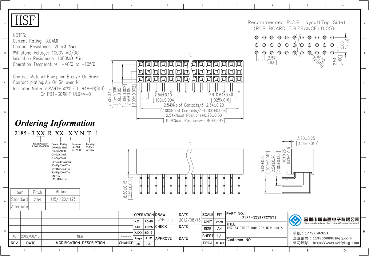 產(chǎn)品分類:排母連接器 產(chǎn)品規(guī)格:2.54MM H=8.5MM 三排 90DIP 排母 廠家 聯(lián)豐盈 產(chǎn)品介紹:額定電流:3.0amp電流電阻:20m最大絕緣電阻:1000mmin耐壓:1000V AC /分鐘工作溫度:40﹣℃+ 105℃接觸