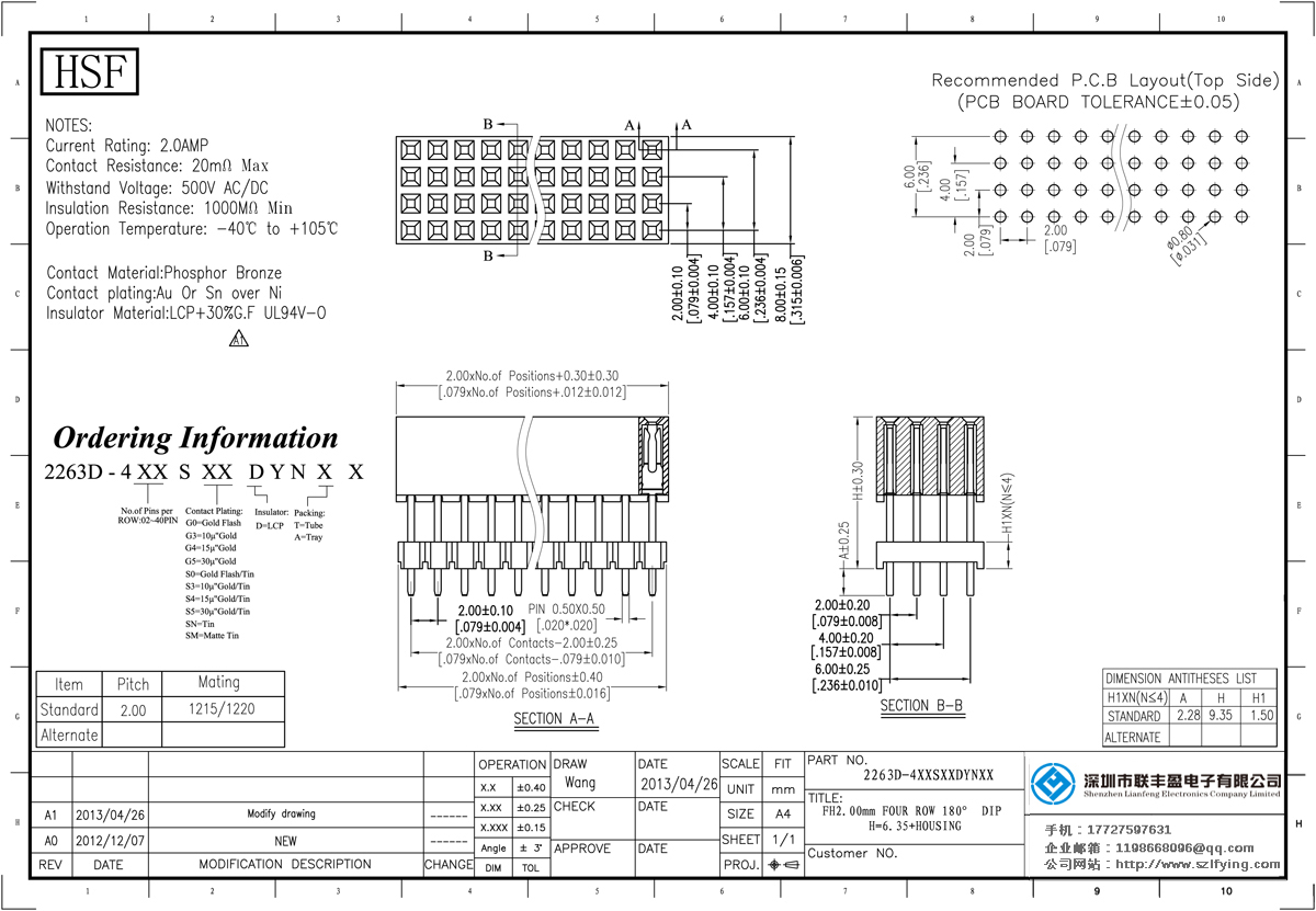 產(chǎn)品分類(lèi):排母連接器 產(chǎn)品規(guī)格:2.0間距 4*30P 180直插,加高一層塑膠 排母連接器 產(chǎn)品介紹:額定電流:2.0amp電流電阻:20m最大絕緣電阻:1000m民承受電壓:AC 500V /分鐘工作溫度:55﹣