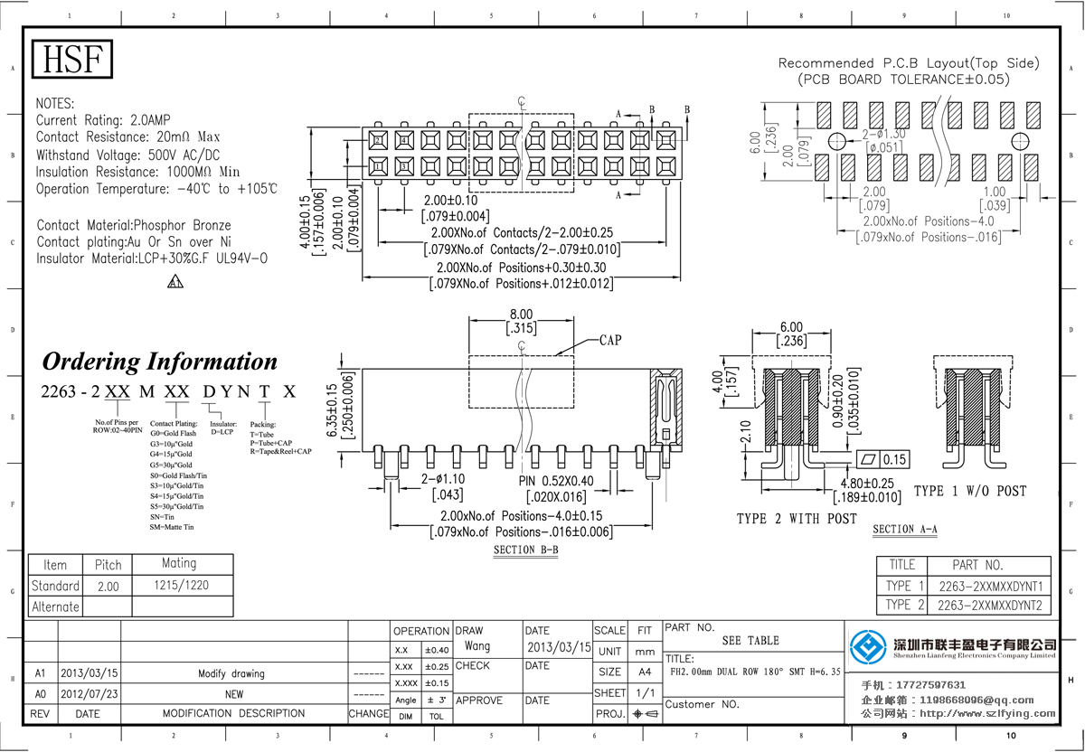 產(chǎn)品分類:排母連接器 產(chǎn)品規(guī)格:聯(lián)豐盈 2.0 排母 SMT LCP料黑色 H=6.35 連接器 產(chǎn)品介紹:額定電流:2.0amp電流電阻:20m最大絕緣電阻:1000m民承受電壓:AC 500V /分鐘工作溫度:55﹣℃+ 1